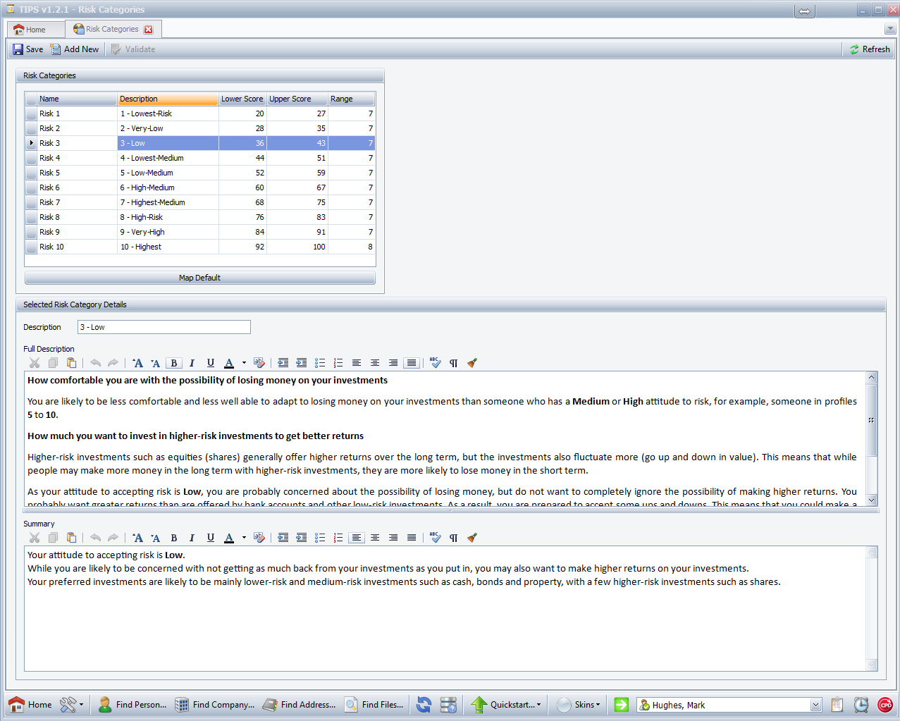 TIPS uses a set of base asset classes (which you are free to choose) throughout the system. From these you can derive asset mixes to describe risk, funds and portfolios - all fully configurable by YOU.